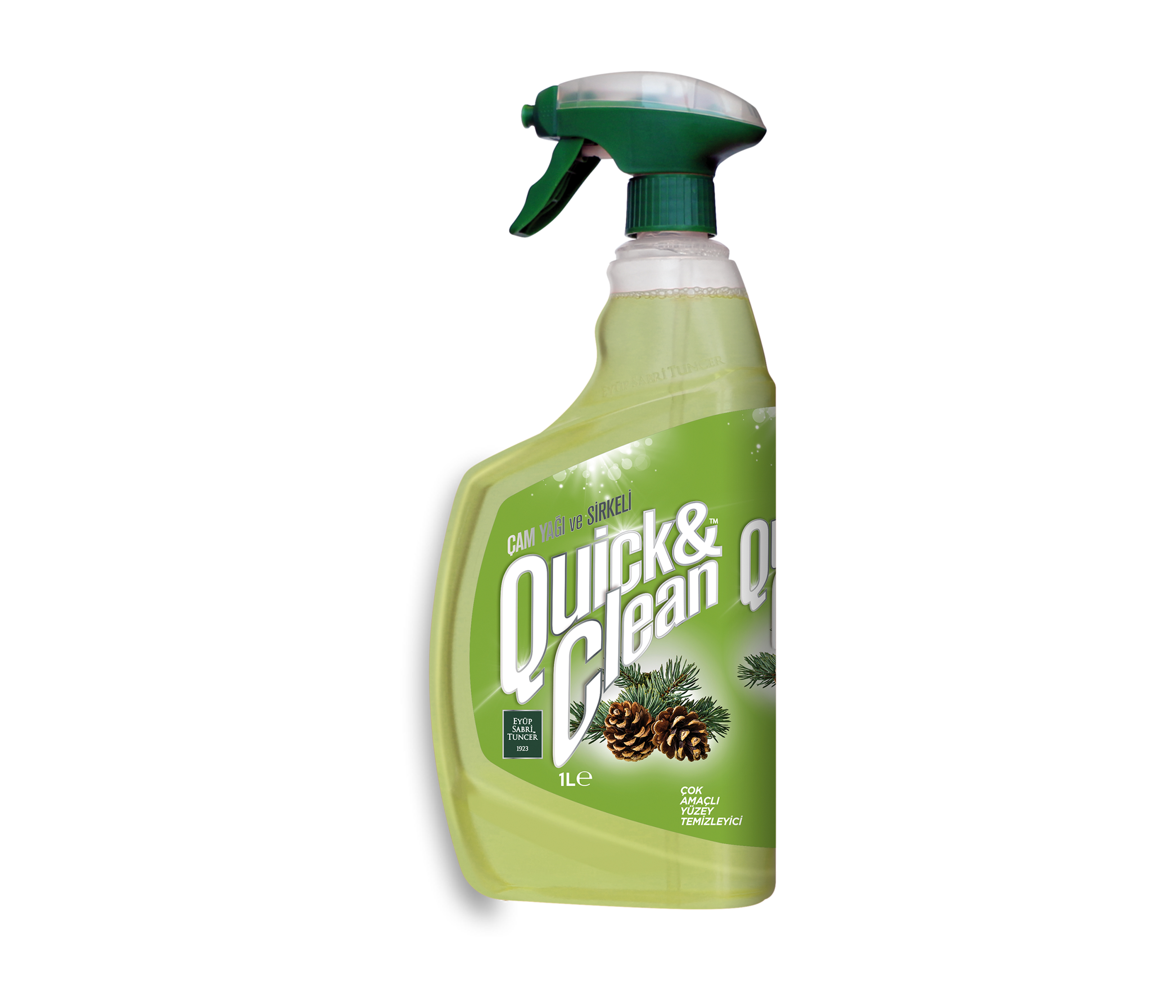 Eyüp Sabri Tuncer Quick & Clean Doğal Çam Yağlı Yüzey Temizleyici, ferahlatıcı çam kokusu ile silinebilir yüzeylerde derinlemesine hijyen sağlar. İçeriğindeki doğal çam yağı, sirke, soda ve isopropil alkol sayesinde, yüzeydeki kir ve lekeleri kolayca temizleyip derinlemesine hijyen sağlarken; çam kokusuyla uzun süreli ışıltı ve parlaklık kazandırır.