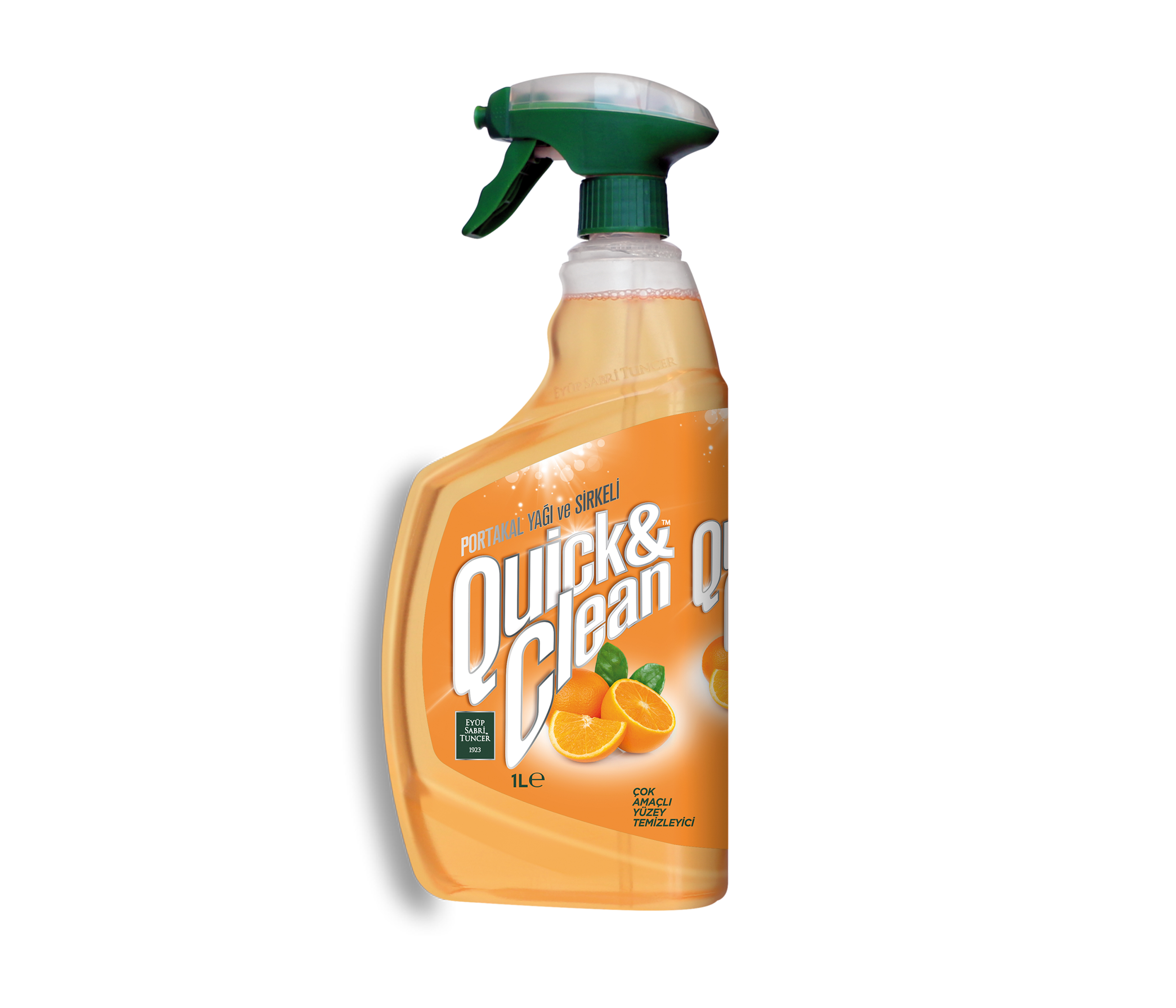 Eyüp Sabri Tuncer Quick & Clean Doğal Portakal Yağlı Yüzey Temizleyici, ferahlatıcı portakal kokusu ile silinebilir yüzeylerde derinlemesine hijyen sağlar. İçeriğindeki doğal portakal yağı, sirke, soda ve isopropil alkol sayesinde, yüzeydeki kir ve lekeleri kolayca temizleyip derinlemesine hijyen sağlarken; portakal kokusuyla uzun süreli ışıltı ve parlaklık kazandırır.